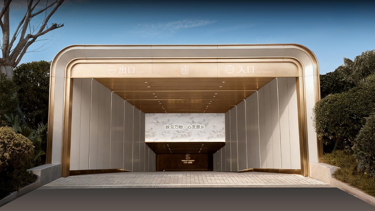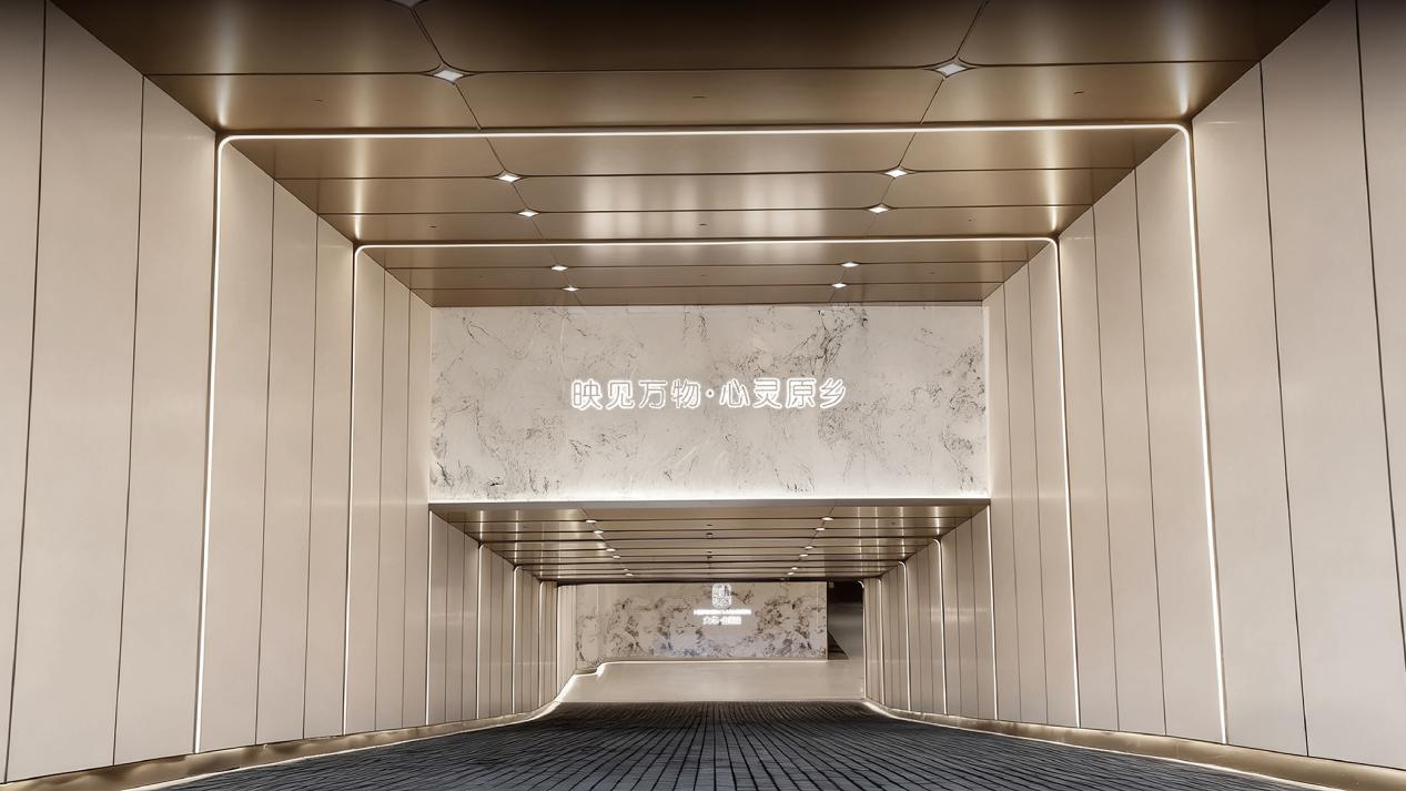 入口处以极致现代工艺美学打造的全铝板门头及吊顶,以其独特的冷峻质感与精准线条,重塑着归家的第一印象。坡道设置的潘多拉岩板景墙,石纹流动,光影交织,于低调中彰显着非凡的气韵,更是进一步将日常归家动线升华至艺术巡礼的维度。
